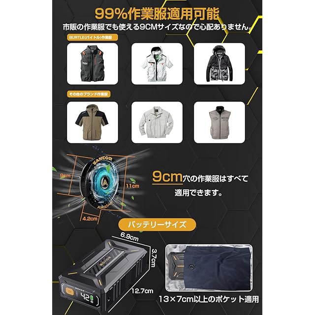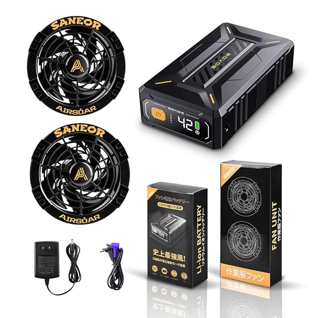 【さまざまな場面で大活躍&迅速な対応】倉庫、工事現場、アウトドア、野外、農作業、運送、建築業界、ガーデニング、配達、イベントスタッフ、日光釣りの際のフィッシングベストとしても春夏シーズンに最適です!作業服適用直径:9cm、電池サイズ:6.9x12.7x3.7cm。セット内容:ファンx2、42Vバッテリーx1、ACアダプターx1、接続ケーブルx1、モバイルバッテリー用取扱説明書x1、ファン用取扱説明書x1。商品が届いた後、初期に不具合があった場合や使用後6ヶ月以内に、商品のがあります。商品ページの「販売元」→「質問する」。メール送信後は12時間以内に返信します!バッテリーの証明書番号:AOCE250305227-EC。アダプターの証明書番号:JD50565692。