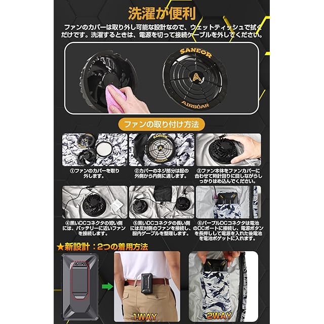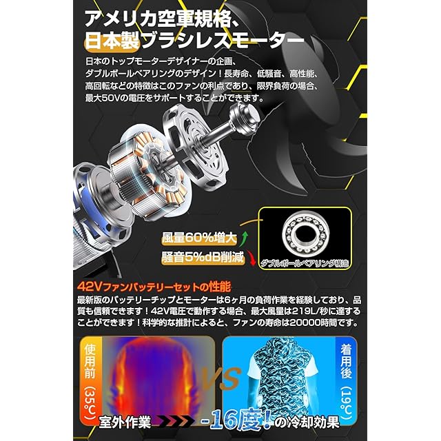 【超強力ファン!日本製ブラシレスモーター】風量増大と騒音低減を両立させるため、日本設計陣は高精度国産ブラシレスモーターを採用し、内部にダブルボールベアリングの構造があり、従来モデルのファンバッテリーセットと比較し、風量60%増大・騒音5%dB削減を実現しました。42V最大風量稼働時でも会話を妨げない静粛性を保持しながら、20,000時間の超長寿命を達成しました。ファンの羽根は鋸歯状設計で、空気の流れを速め、風量を大きくすることができます。ファンの保管については、ファンのフロントカバーが取り外し可能で、ファンの羽根を洗うのにも便利で、ウェットティッシュで拭くだけで十分です。