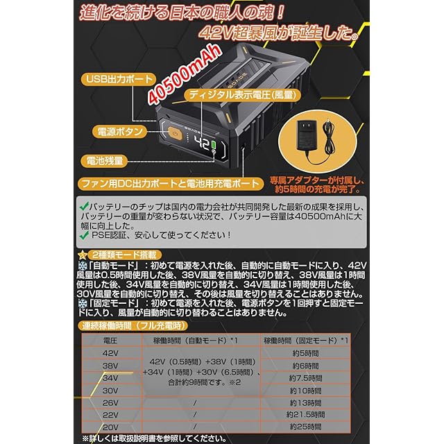 商品名:【42V超高出力 40500mAh大容量バッテリー】作業着 ファンバッテリー セット 暴風 最大25時間使用時間 7段階風量調節 2種類モード搭載 男女兼用 日本語説明書付き[日本国内ブランド正規品]