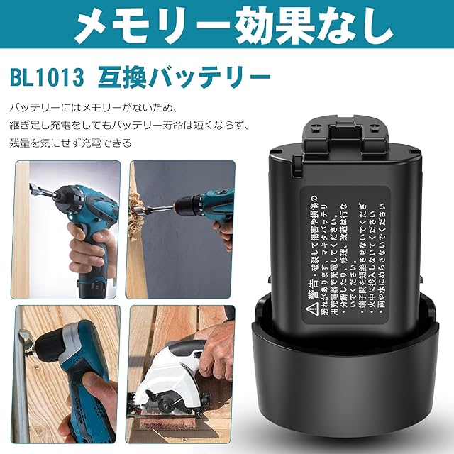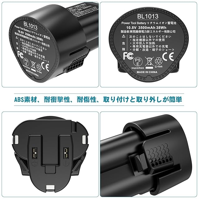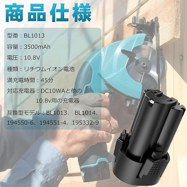 【製品仕様】商品名:BL1013 マキタ互換バッテリー 、電圧:10.8v、容量:3500mAh(3.5Ah)、電池 種類:リチウムイオン電池 、高度なセキュリティ。純正同等のスムース脱着。