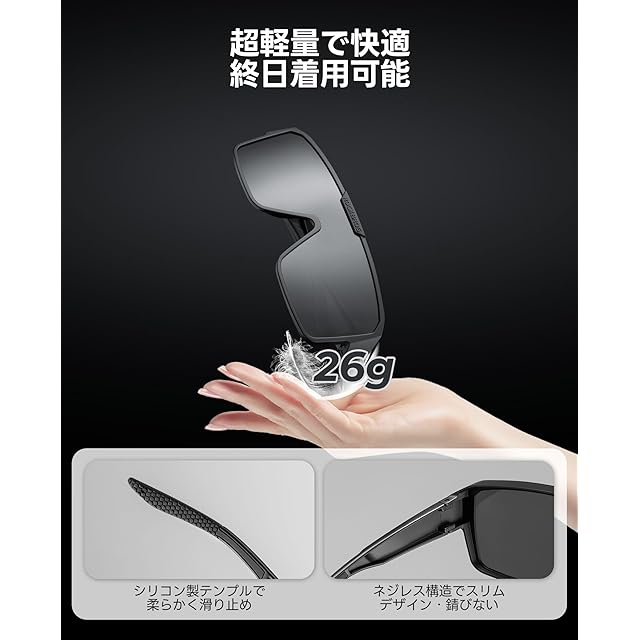 【超軽量・掛け心地よい】超軽量高弾性素材PCを採用し、柔らかくて耐摩耗性に優れて弾力性もよいです。26g超軽量設計で耳への圧迫感も軽減し長時間の装着も快適にお過ごしいただけますよ。シリコン製テンプルで柔らかく滑り止め抜群、ネジレス構造デザイン・錆びない、高耐久性です。