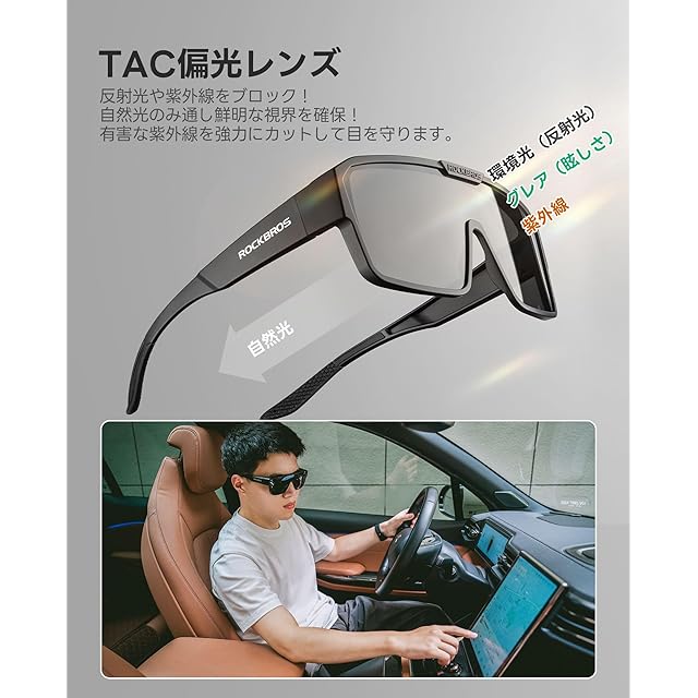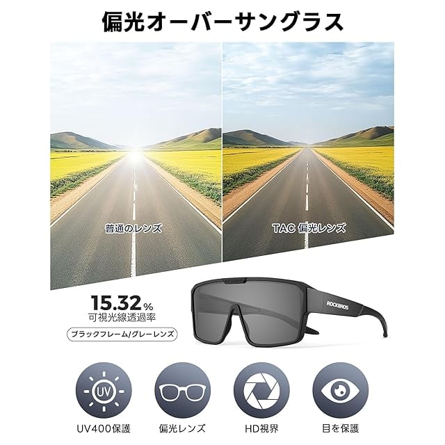 【眼鏡ユーザー専用設計】ROCKBROSのオーバーサングラスはメガネの上に掛けられる偏光サングラスです。普段のメガネの上から掛けるだけで一瞬で偏光サングラスへ早変わり、メガネを掛けていない時も違和感なく、サングラス単体でファッションとしてお楽しみいただけます。いろいろなサイズのメガネに合うために、特大なTAC偏光レンズを採用しました、近視、遠視、老視の眼鏡かけた人もご利用できます。