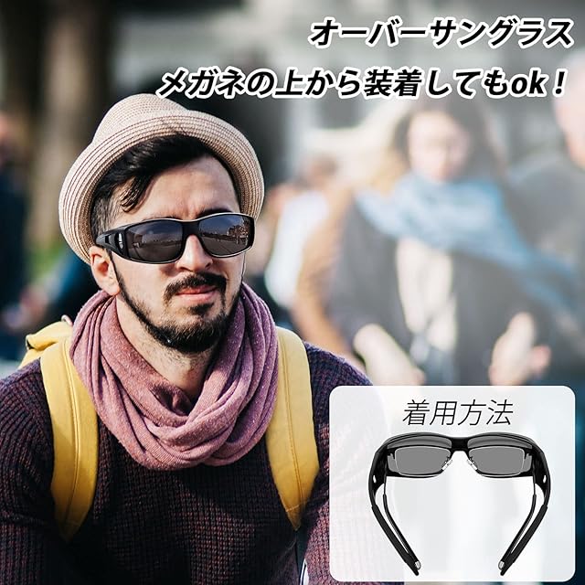 眼鏡着用者の福音書:オーバーサングラスとはメガネの上に掛けられる機能的なサングラスです。メガネの上からはもちろん 、メガネなしでも直接掛けることができます。いろいろなサイズのメガネに合うために、レズン特大なTAC偏光を採用しました、近視、遠視、老視の眼鏡かけた人もご利用できます。二重メガネを掛けても、違和感がなく、逆に掛ける人がおしゃれなオーラがさしているようなかっこいいサングラスです