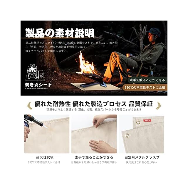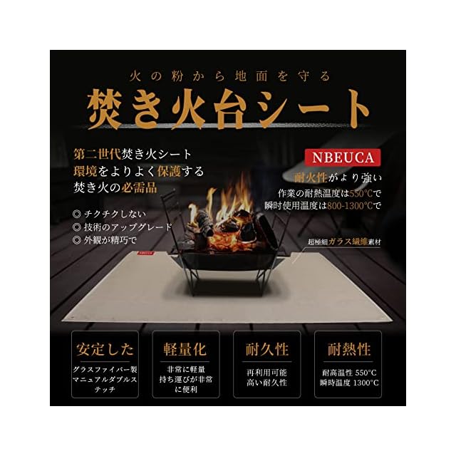【耐火性がより強い】耐熱シート は直径がより細い8umガラス繊維採用し,難燃性と空気密度は普通の焚き火台シート高く、作業の耐熱温度は550℃で、瞬間使用温度は800-1300℃に達します。