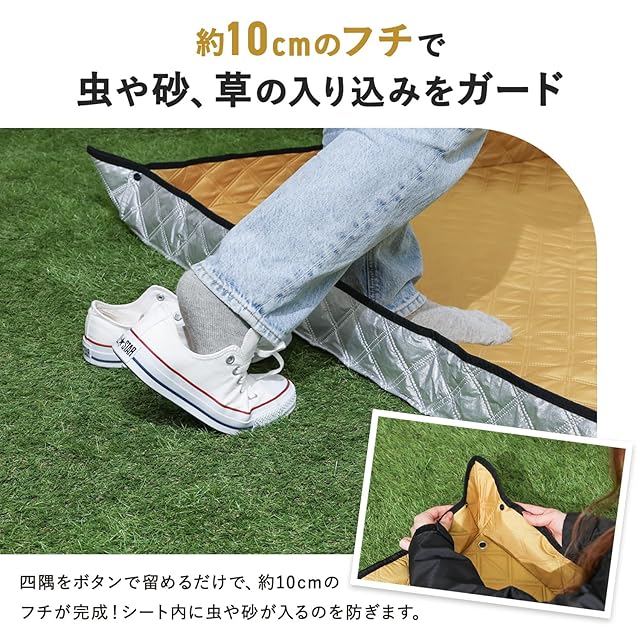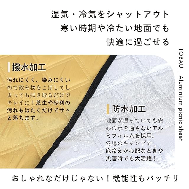 【機能性】①アルミシートで高い保温効果②コーナーループ付き③折りたたみ式で収納袋いらず④撥水・防水加工⑤高い耐久性⑥洗濯可能