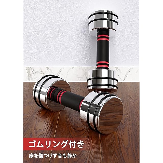 【家庭での使用に最適】サイズが小さく、収納しやすいです。また、縦置き可能なため、スペースを占有しません。純鋼製でビニールコーティングを施していないため、トレーニング中や保管時に不快な臭いが全くしません。シンプルな形状と鏡面仕上げのクロムメッキ表面で、家の中に置いても芸術品のようであり、見た目にも美しいです。付属のゴムリングはダンベルプレートの溝部に簡単に取り付けることができ、床を傷つけず、音も響きません。必要に応じて取り付け可能です。