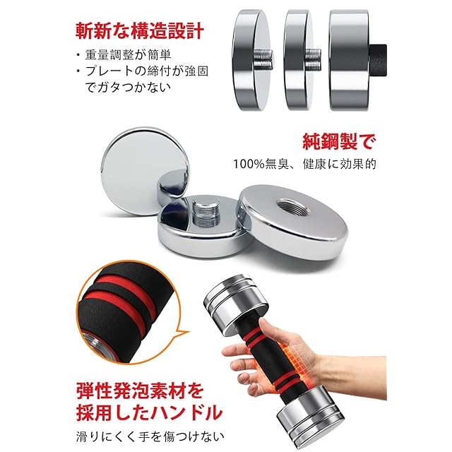 【安全で丈夫な設計】ダンベルプレートは溶接せずに、高品質な一つの鋼材から精密に切り出しました。各ダンベルプレートを相互に固定することで、従来のダンベルに見られた、ナットの緩みによるダンベルプレートのガタつきの問題を解消しました。グリップにはクッション材を採用し、無臭であり滑りにくく、手を傷つけません。また、重みによる手の痛みが軽減されるため、トレーニングを継続しやすいです。