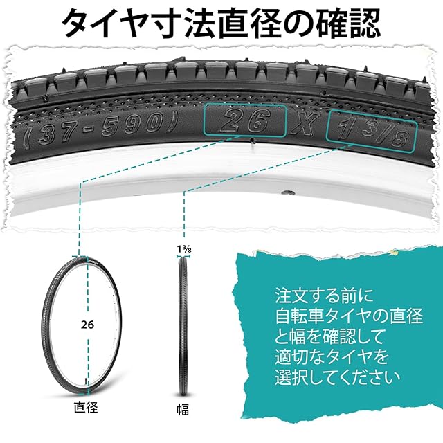 タイヤ仕様:自転車タイヤ 26 x1 3/8インチ(ETRTO: 37-590 mm)、30TPI;最大65 PSIまで空気を入れてください。チューブ仕様: ペアの自転車チューブは、サイズが26 x 1 3/8インチで、米式32mmバルブ対応です。