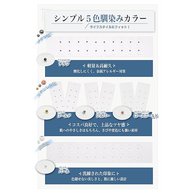 【高品質素材にこだわり】当社のチタン粒はメディカルグレードのチタンを採用。酸化しにくい特性に加え、金属アレルギー対策済み。高品質ステンレス製粒(ゴールド/シルバー/ローズゴールド)は肌に優しい、さびや変色にも強く、美しさが長く持続。高級樹脂を使用するパール粒は、色褪せない美しさを実現しながら、肌への負担を軽減。表面のジュエリーパーツには上質な天然素材を厳選使用。敏感肌にも安心の肌に優しい設計で、高い耐久と快適な装着感を両立。