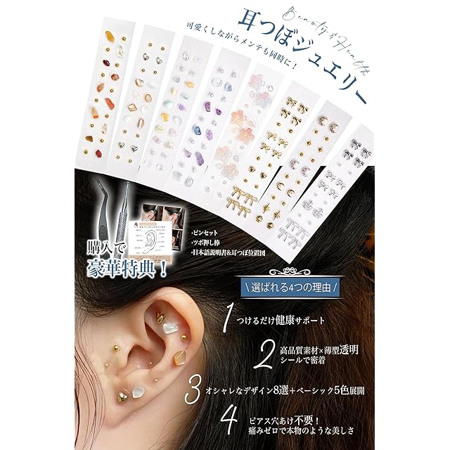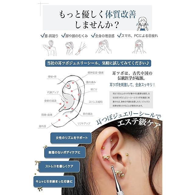 【つけるだけ健康サポート】当社の耳つぼジュエリーシールはツボマッサージ理論とトレンデザを融合させたアイテムです。不調をケアしながらアくセ感覚でおしゃれに盛れ、一石二鳥の美容メソッド。耳には全身の健康状態を反映するつぼが集中しており、耳つぼジュエリーを着用することでツボが適度に刺激され、体調改善やリラックス効果があります。