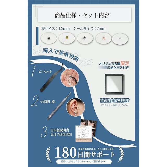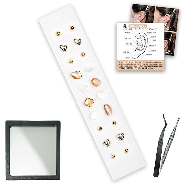 【初心者でも安心セット】専用ピンセット・ツボ押し棒・日本語説明書・耳つぼ位置図の全点付き。初心者でもすぐ始められる充実セットです!ピアス穴がなくても、金属アレルギーでイヤリングが苦手な方でも、手軽に貼れて簡単お手入れ。1年間の返品付き(※プラットフォーム期間外も対象)。万が一ご満足いただけない場合も全額返金または交換いたします。
