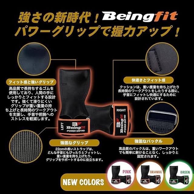 【プレミアム品質】Beingfit パワーグリップ プロは、ウェットスーツ素材としても使われる高品質クロロプレンを採用。優れた耐久性と柔軟性で、デッドリフトや懸垂、ベンチプレスなど様々な種目で安定したグリップをサポート。バックル部分には錆びにくく丈夫なクローム加工を施し、長く快適に使用できます。