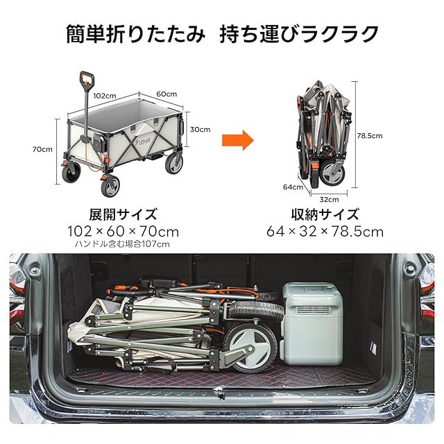 【自走式・折り畳み】電動キャリーワゴンは最先端のGTデュアルアクスル駆動自走モジュールを搭載して、ボタンを押すだけで自動的に走り出します。重い荷物を運んでも力がほとんど要りません。平地だけでなく、坂道も軽々対応できます。大容量なのに、折り畳めばコンパクトに収納できます。車のトランクに置いても、家の玄関やベランダに置いてもほとんど場所を取りません。