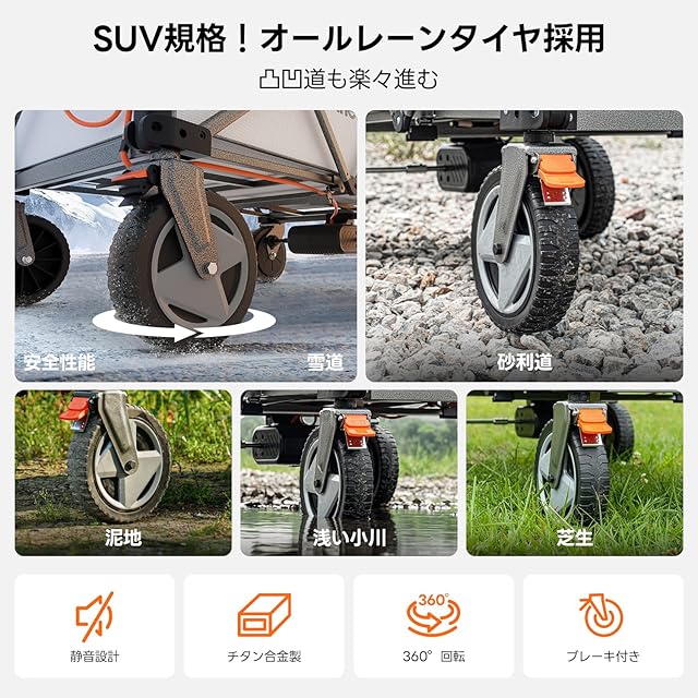 【SUV規格ワイドタイヤ】SUVやオフロード車にも使用されるオールテレーンタイヤを採用しており、8インチのワイドタイヤなので舗装路から凸凹道までパワフルに走破できます。前輪は360度回転でき、電動自走式キャリーワゴンは山道や砂利道、芝生、泥地などあらゆる地形に対応可能です。