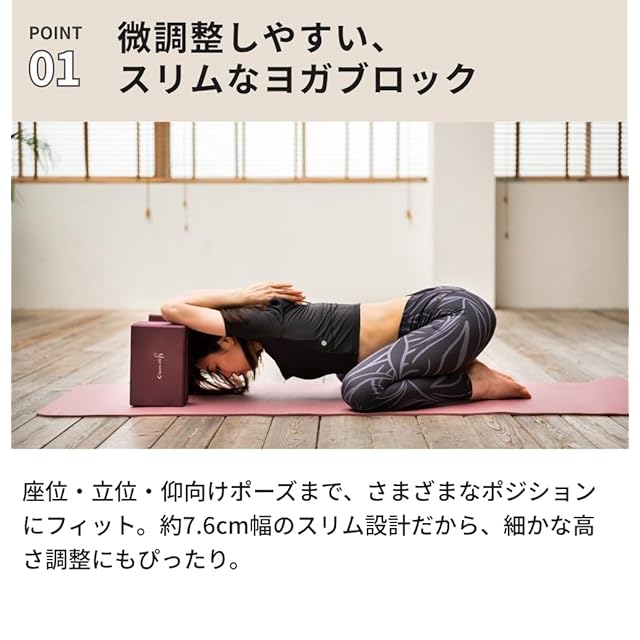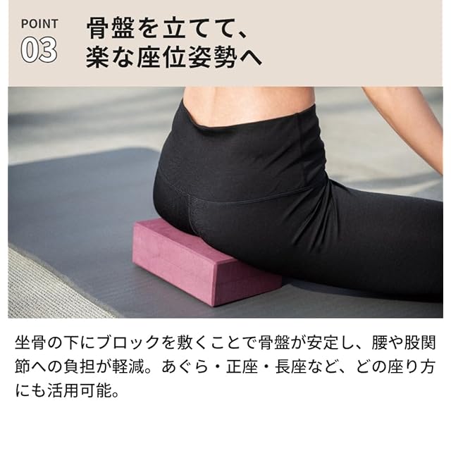 スリムな7.6cm幅で細かなポーズ調整に最適。正座や骨盤サポートにも使える高密度ヨガブロック。