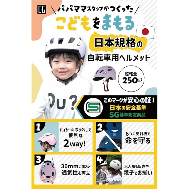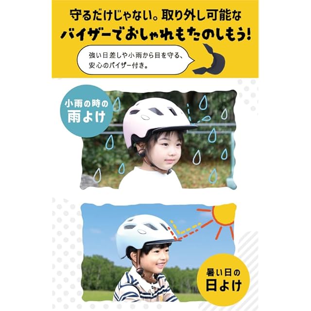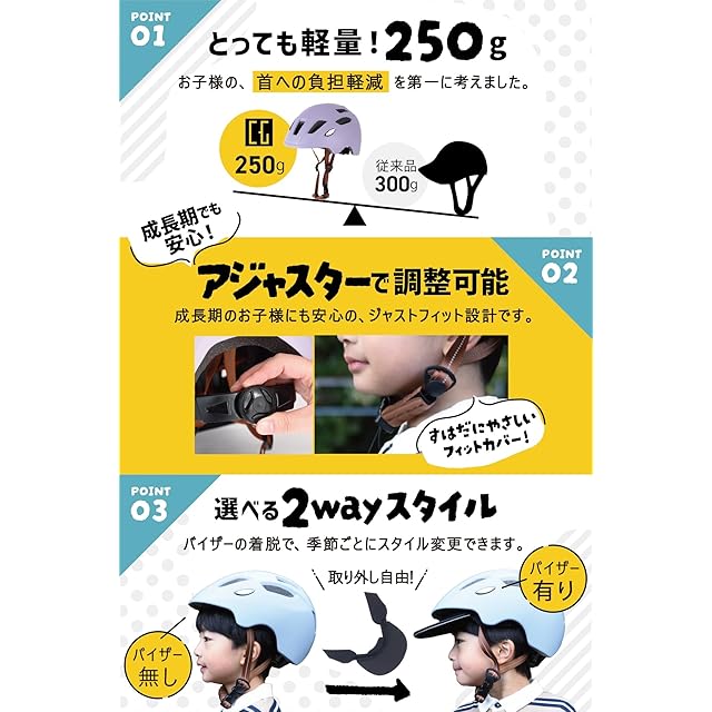 【よりフィットする日本人規格を採用!子どもを守る7つのポイント】 ①:超 軽量 250g。首への負担軽減を考えました。 ②:アジャスター付きなので成長期の 小学生 幼稚園 児 のお子様でも安心です。 ③:取り外し可能なバイザー付きで日差しが強い日は日差しからも守ります。 ④:11個の通気口で湿気や熱がこもるのを防ぎます。 ⑤:最大30mm厚のクッションで衝撃を吸収します。 ⑥:6つの反射材で薄暗い道での安全も守ります。 ⑦:こだわりのスポーツタイプ ヘルメット 。前につばが出ている形状なので転んだ際にお顔を守ってくれます。