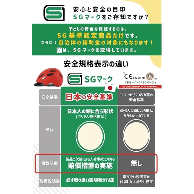 【パパママスタッフが考案しました。安心安全のSGマーク認証ヘルメット】弊社のパパ・ママのスタッフ達がより 子供 の安全を守るために機能を追求した sg規格の 子供用ヘルメット です。 SG規格 は CEマーク や CPSCマーク など他の安全規格と違って【事故賠償制度が適用される】【日本国内の安全基準に合格している】の2点が特徴です!安全基準・製品認証・事故賠償が一体となった世界的にも類を見ない規格で、政府も sgマーク などの認証を受けた ヘルメット の着用を奨励しています。