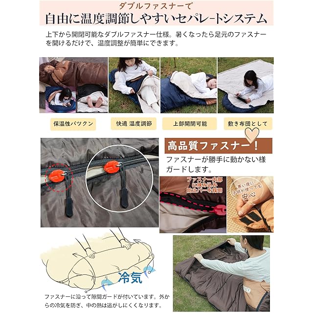 【最新裁縫技術】:まっすぐに縫われ、糸が出てなく、きれいで清潔。高級感が持つ寝袋。ダブルファスナーはサイドも足元も開閉でき、シーズンに応じて温度調節も楽々です。