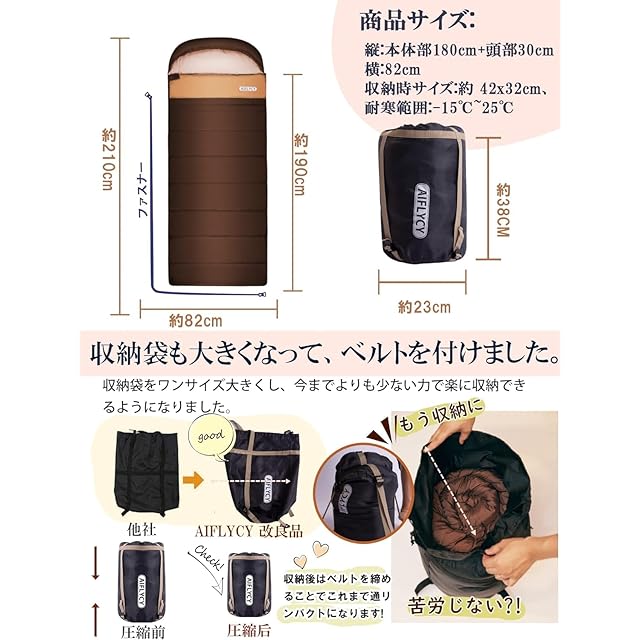 【商品サイズ&品質サービス】使用時:(約)210×82cm; 広げた時:(約)210×160cm; 収納時サイズ:約 35×17cm 重さ:約1.8kg 最低使用温度:-15℃ 快適温度10℃です。100%注意:体感によって体感温度が異なりますので、お客様の体調に合わせて、ご自身にあった重量の寝袋を選ぶことをお勧めしています。また、気温によりブランケットと一緒に使うのもおすすめ致します。重さ:約1.4kgは耐寒範囲:約-10℃ ~ 25℃,重さ:約1.8kgは耐寒範囲:約-15℃ ~ 25℃,重さ:約2.2kgは耐寒範囲