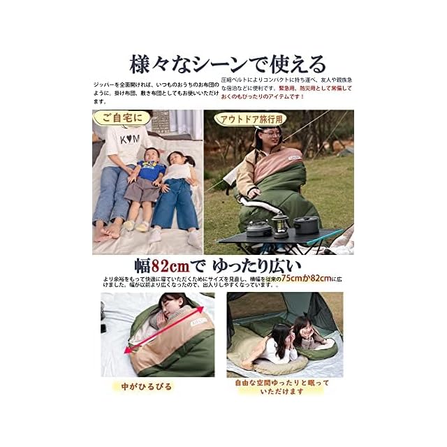 【商品サイズ&品質サービス】使用時:(約)210×82cm; 広げた時:(約)210×160cm; 収納時サイズ:約 35×17cm 重さ:約1.8kg 最低使用温度:-15℃ 快適温度10℃です。100%注意:体感によって体感温度が異なりますので、お客様の体調に合わせて、ご自身にあった重量の寝袋を選ぶことをお勧めしています。また、気温によりブランケットと一緒に使うのもおすすめ致します。重さ:約1.4kgは耐寒範囲:約-10℃ ~ 25℃,重さ:約1.8kgは耐寒範囲:約-15℃ ~ 25℃,重さ:約2.2kgは耐寒範囲:約-20℃ ~ 25℃。【購入】1年間の品質を付いており、もしも商品がお手元に届かない、もしくは商品に問題があった場合はお手数おかけ致しますが、お問い合わせメールアドレスにご連絡ください。サポート担当者が迅速に対応させていただきます。
