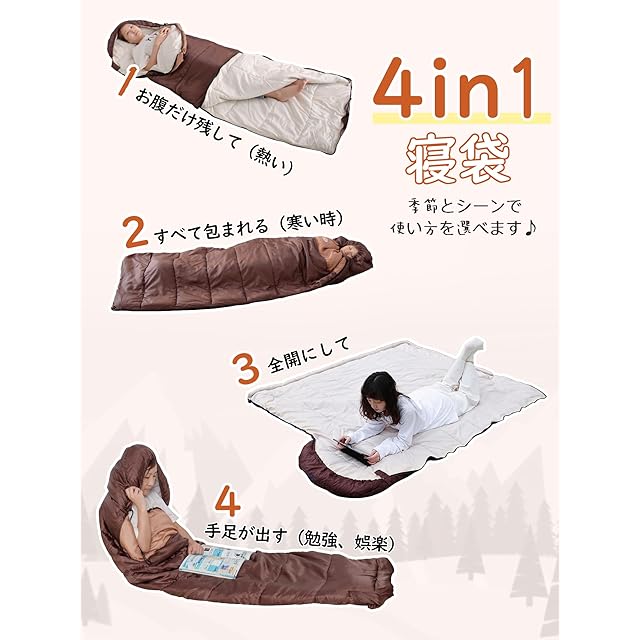 【封筒型の実用デザイン】封筒型で、内部に余分なスペースがあり、中で手足を伸ばしたり、楽に寝返りを打てますので、窮屈感が全くありません!帽子には収縮コードとマジックテープで襟元も閉めることができ、寒気を防いでちゃんと保温してくれます。ダブルファスナーを採用なので、足元から肩まで、内外側どちらからでも開閉でき、温度調節でも簡単です。足元のファスナーを開けば、足を自由に動かせて快適です。寝袋のポケットには、時計や携帯電話などの小物を収納できます。着替えた服をサッと枕に変身できる「枕カバー」が付属し、枕を携帯する必要がありません。