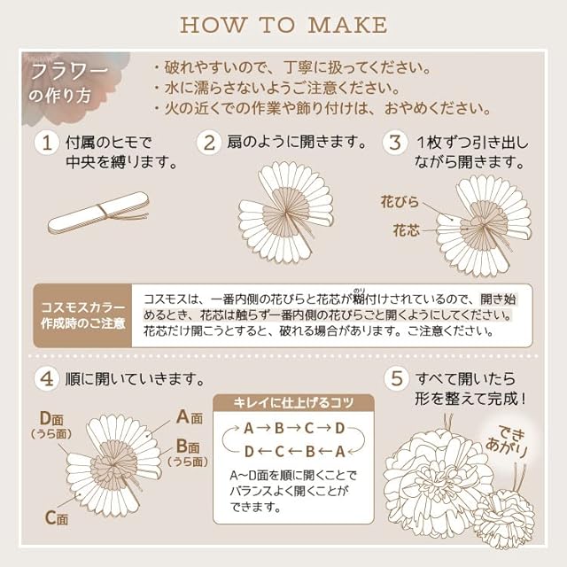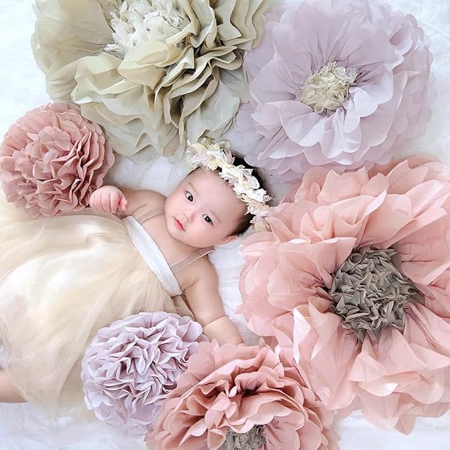 【作り方】大きなジャイアントフラワーがアクセント。大切なハーフバースデー、100日祝い、お誕生日など記念日やイベントを華やかに盛り上げてくれます。園芸用の支柱で、茎付きフラワーのアレンジもできます。作り方は、じゃばらに折りたたまれた薄紙を一枚ずつ開いていくと、美しいジャイアントフラワーのできあがり。