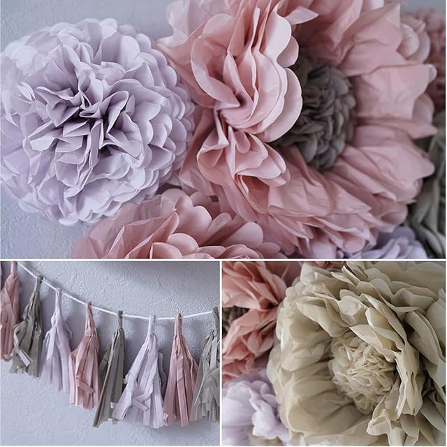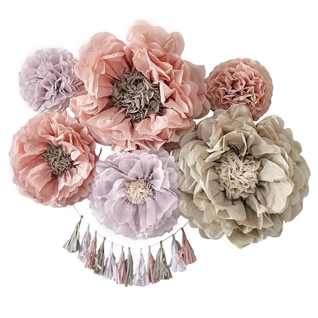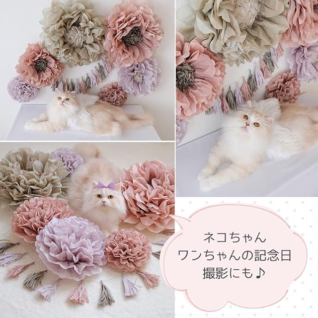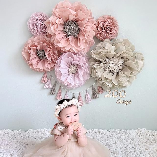 【メイクフェアリーフラワーセット】くすみピンクと紫のお花のペーパーファンがかわいい!ハーフバースデー、100日祝い、お誕生日にぴったりな飾り付けセット。存在感のある大中小6個のお花と同系色のタッセルガーランドが入ったバースデーデコレーション。