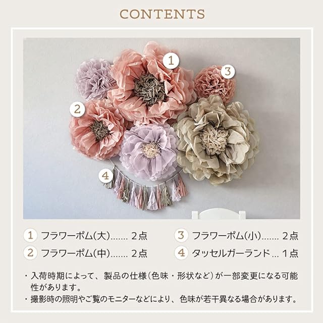 【セット内容】フラワーポム(大):2点(直径 約45cm)フラワーポム(中):2点(直径約30cm)、フラワーポム(小):2点(直径 約20cm)、タッセルガーランド:1点(幅 約60~70cm、高さ 約12cm、ひも長さ 約290cm)