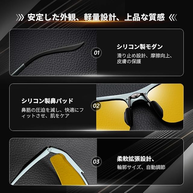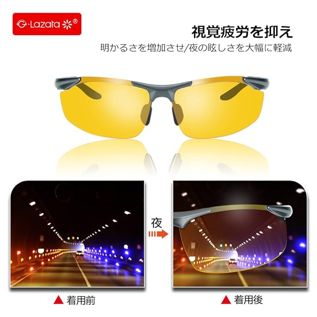 ✅➤【黄色い偏光レンズ】:イエロー偏光レンズは夜間の対向車のライトの眩しさ、道路の照り返しや乱反射を軽減でき、曇り、霧、夕方、夜や雨の日も視界が明るく運転が楽になります。夜間運転、夜間通勤、夜間ランニング、夜間スポーツと夜間アウトドアに良い視界を提供します!