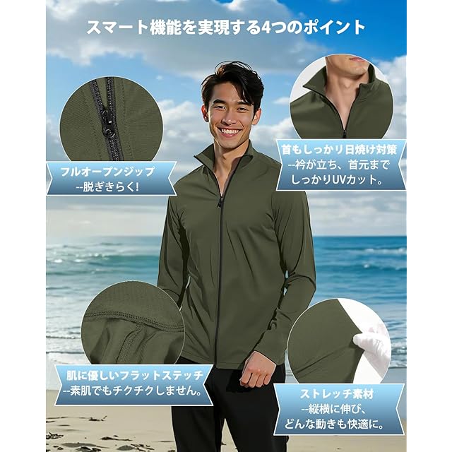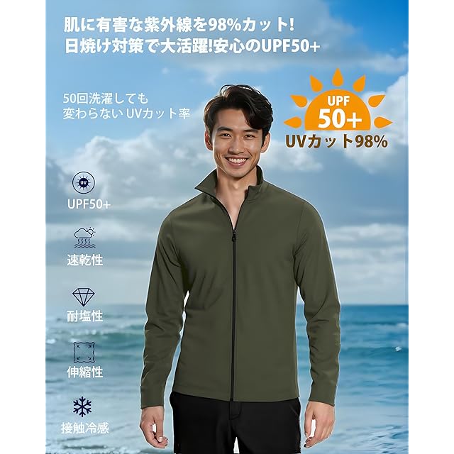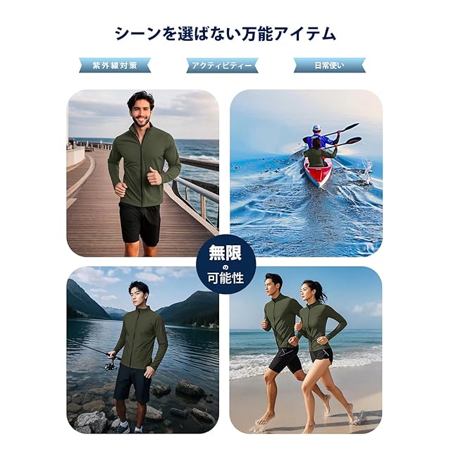 [Umely] 【2025 冷感×速乾】 ラッシュガード メンズ 長袖 フルジップ UPF50+ 接触冷感 ストレッチ 無地 水陸両用 UVカット 軽量 大きいサイズ 体型カバー 海 プール 釣り ジム スポーツ対応 S~2XL | つむぎ屋