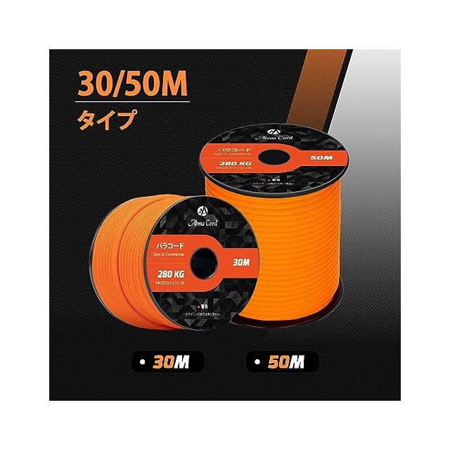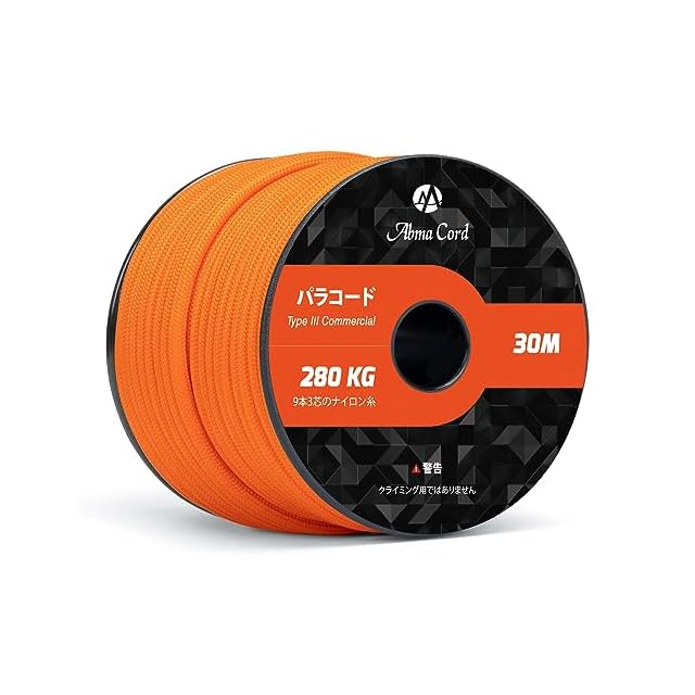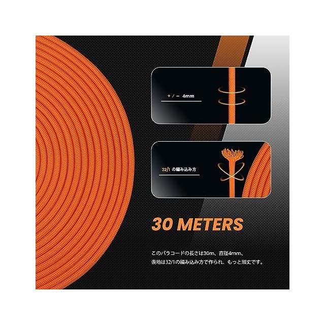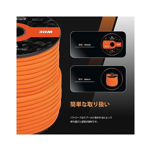 【材質とサイズ】100%ナイロン、内芯:9芯。パラコードの表面は滑らかで、触感が良いです。約4mm(太さ)×30m(長さ)、290g(重さ)、吸湿性が低いので劣化しにくい特徴もあり、持ち運びや保管に便利です。