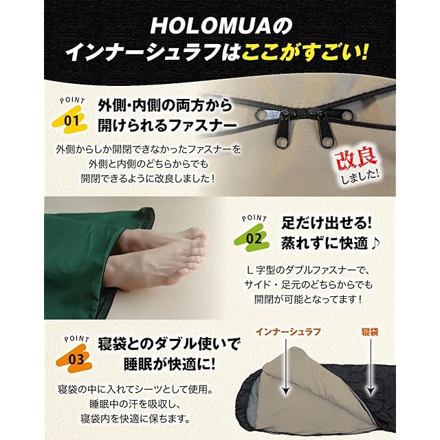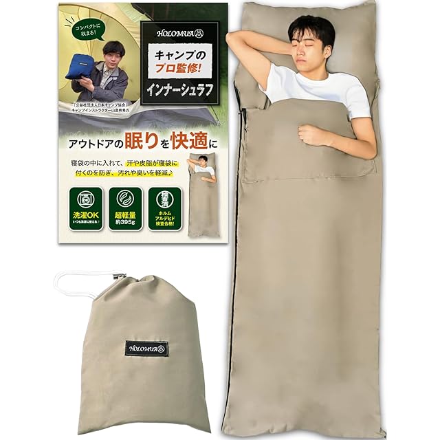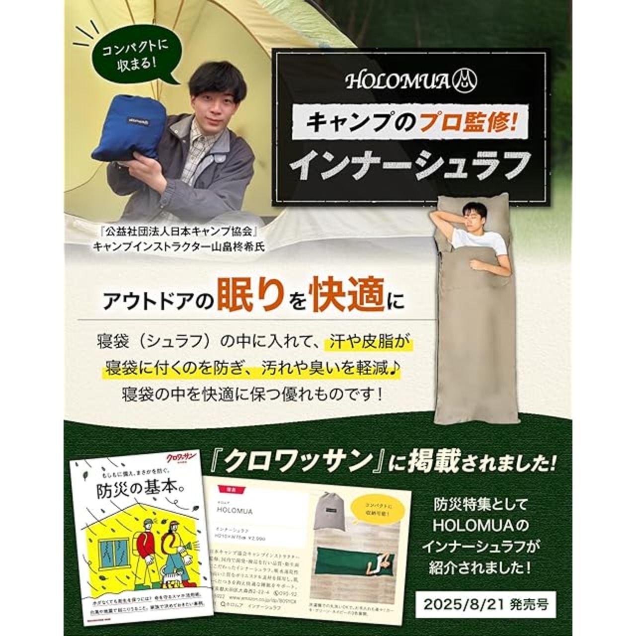 【雑誌掲載モデル】 インナーシュラフ 【キャンプのプロ監修】 【アウトドアの眠りを快適にxインナーシーツ】【超軽量xコンパクトで便利】 寝袋 オールシーズン 登山 防災 封筒型 HOLOMUA