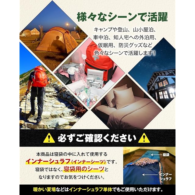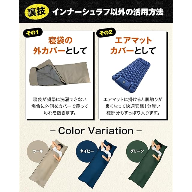 【公益社団法人日本キャンプ協会のキャンプインストラクター監修】当社の インナーシュラフ は日本のアウトドアやキャンプをする方のためにキャンプ指導者の監修の元、少しでも使いやすいようにと考えながら商品開発を行っています。吸水速乾の高い上質なポリエステル素材を採用することで「このインナーシュラフとシュラフ( 寝袋 )を重ねるだけで睡眠中の汗や汚れを防ぎ快適な睡眠時間を過ごせる」ことをモットーに商品製作を行っています。