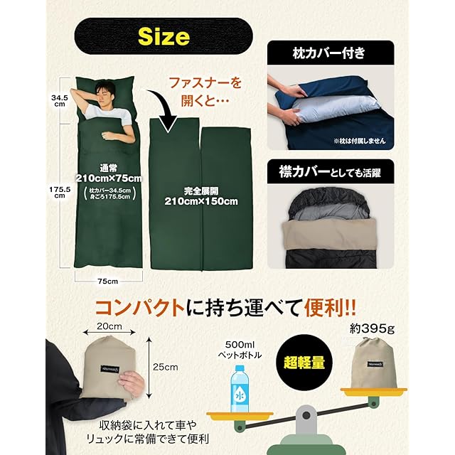【商品仕様】使用時:約210cm×75cm 完全展開:約210cm×150cm 収納時サイズ:縦約25cm×横約20cm×幅(厚み)約5cm 重量:約395g ✿当社のインナーシュラフはキャンプ、登山、ハイキング、フィッシング、BBQ、車中泊 での インナーシーツ やお昼寝用、出張や旅行時にシーツの上に敷くなど多機能に利用可能。もしもの災害(防災 地震)時にも使用可能です。また、洗濯機で丸洗い可能なので清潔に使用できます。