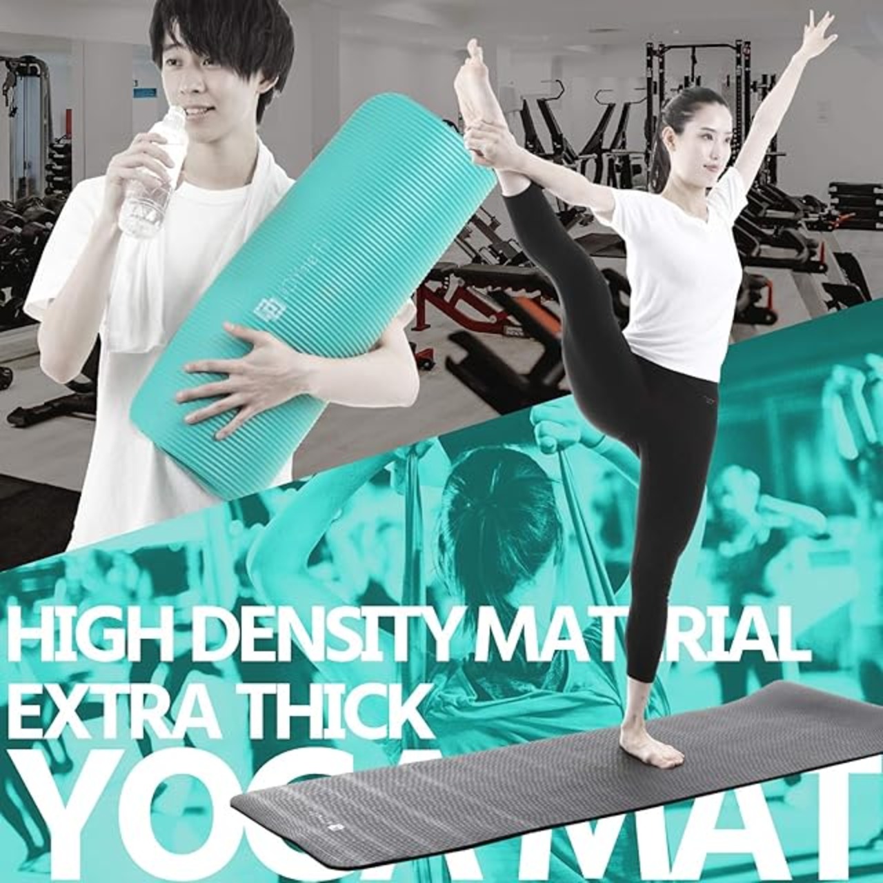 【商品詳細】カラー: ターコイズ / サイズ:縦183×横61×厚さ1.5cm / 重さ:1200g / 素材:高密度ニトリルゴム / 用途:ヨガ、ホットヨガ、ピラティス、ストレッチ、筋トレ、腹筋ローラー、エクササイズ、トレーニング、体操、レジャーマット、アウトドアマットなど