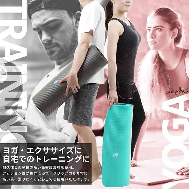 【商品詳細】カラー: ターコイズ / サイズ:縦183×横61×厚さ1.0cm / 重さ:800g / 素材:高密度ニトリルゴム / 用途:ヨガ、ホットヨガ、ピラティス、ストレッチ、筋トレ、腹筋ローラー、エクササイズ、トレーニング、体操、レジャーマット、アウトドアマットなど