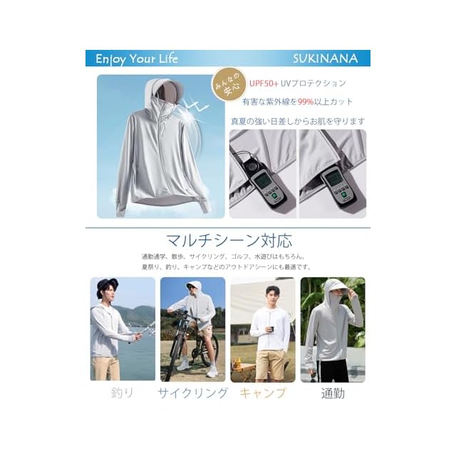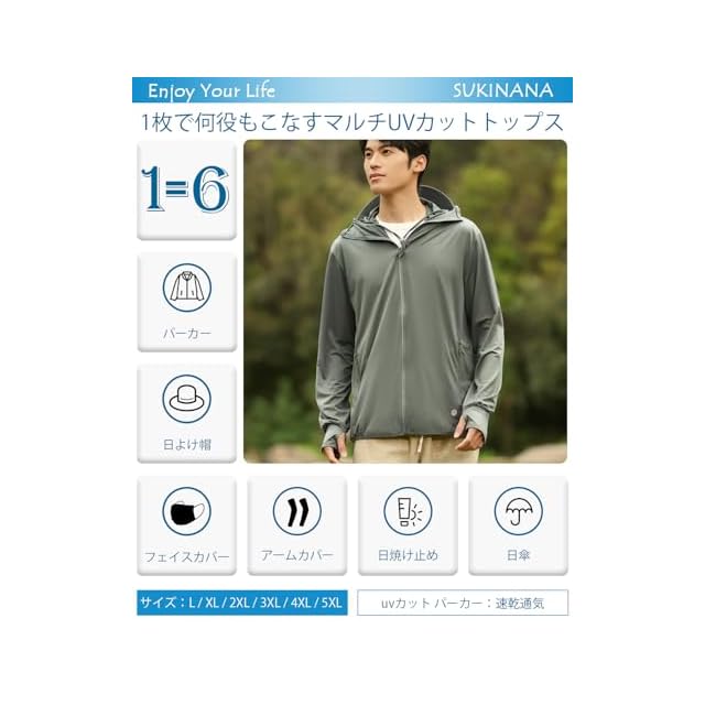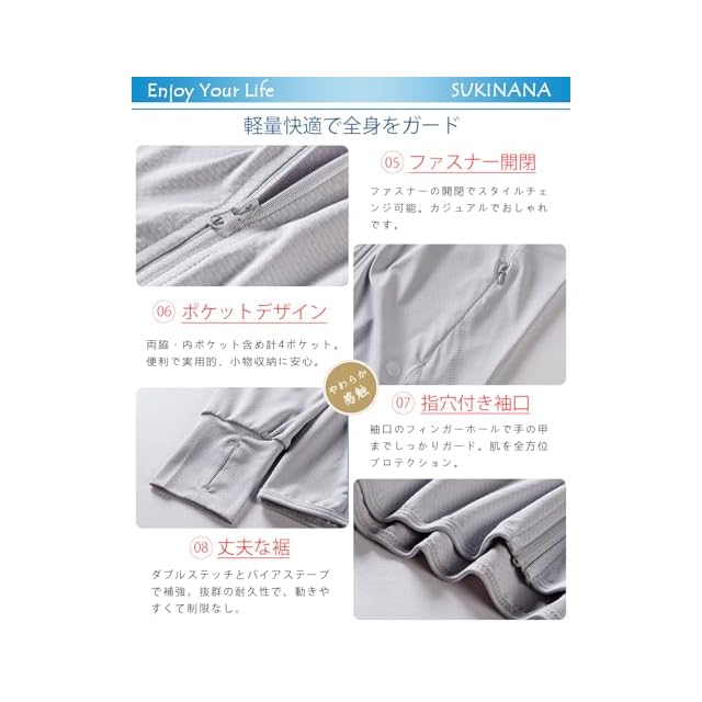 「機能性抜群」フィンガーホール付き袖口で手の甲までラクラクガード。フロントファスナーが首元までしっかり保護。ブリムとフェイスカバーは用途に合わせて取り外し可能。1枚で何役もこなすマルチUVトップスです。