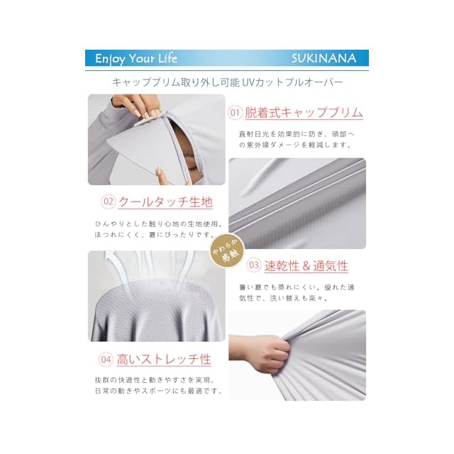 「UVカット性能」UPF50+の最高峰UVカット性能で、肌に有害な紫外線を99%カット!取り外し可能なワイドブリム付きでとても便利。完璧なUV対策の必須アイテム!
