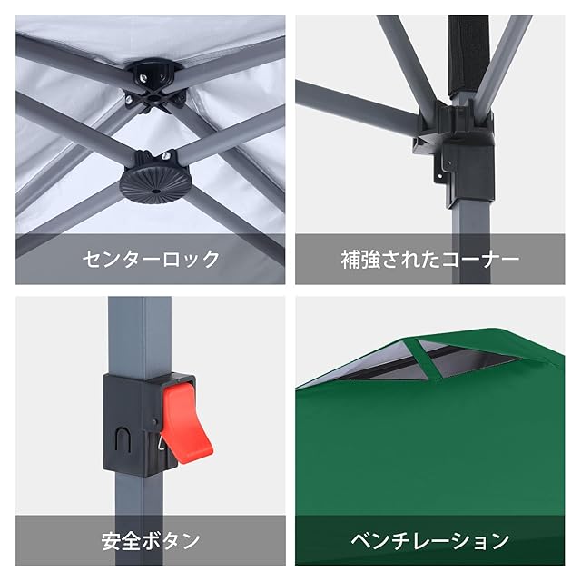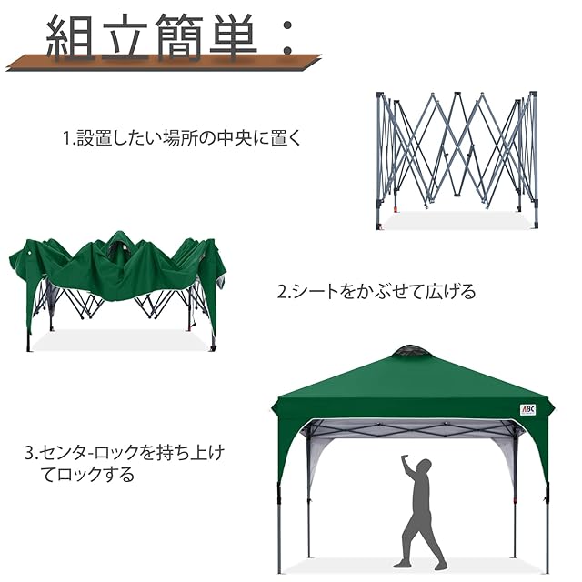 【組立簡単】:2人で簡単に3分で設営!フレームと屋根シートを取り出し、フレームを広げ、フレームの上に屋根シートを置き、足を伸ばすだけで組み立てが完了します。安全ボタンを採用して、3段階調節ができます、テントの設置場所や使用環境に合わせてワンプッシュで調節。
