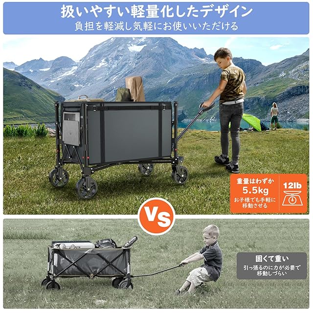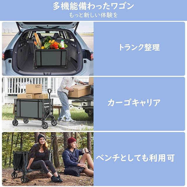 「沢山の荷物を一回で楽に移動」 多くの荷物をまとめて一度に運べるのはキャリーワゴンです。重量感のある物でも腕が疲れることもなくより手軽に移動させることができます。荷運びのあとに荷物置き場としてもご活用いただけます。積載スペースを大容量の120Lに設計したため、荷物を出し入れをより簡単に行えるうえ、ありったけのキャンプ道具や日常生活の中で重いモノを運んだり、より多くのいわゆる荷物を乗せてスーツケースのように引いて移動させる時に大活躍してくれます。