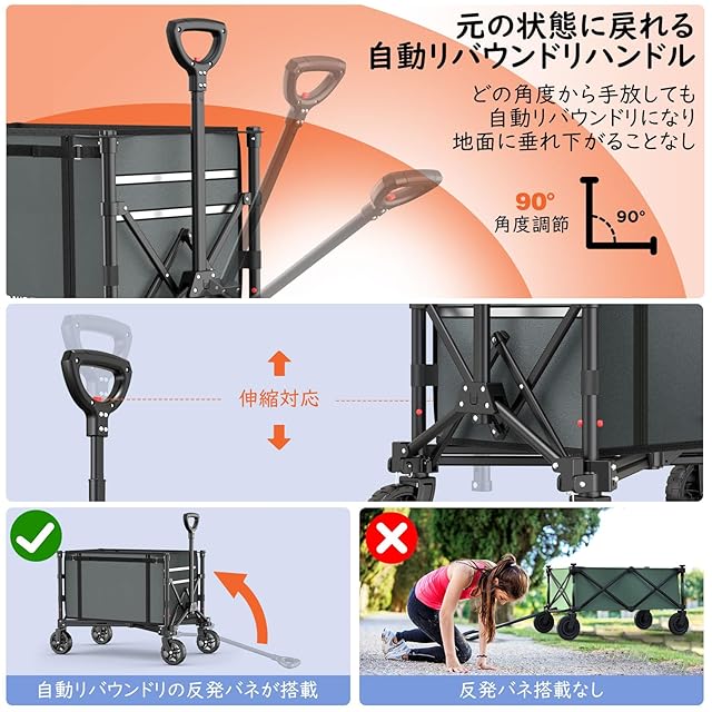 「移動しやすい思いやりのある仕様」 指への負担を軽減しながら自然な形になるハンドルの仕様より、どの方向からも片手でも握りやすくなり、力を加えやすくて効率的に伝われて、力加減や方向転換も手軽に調整できて快適にワゴンを動かせます。加えて、収納性にも優れており、赤色ロックを押しながら、伸ばしたり収縮したり必要に合わせて調整可能になります。さらに反発バネが搭載し、どの角度から手放しても自動リバウンドリになり、元の状態に戻れて地面に垂れ下がることがありません。