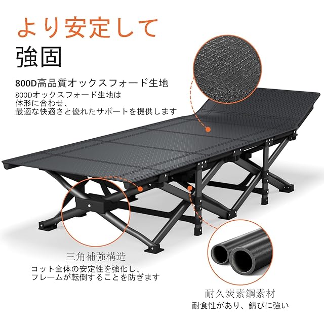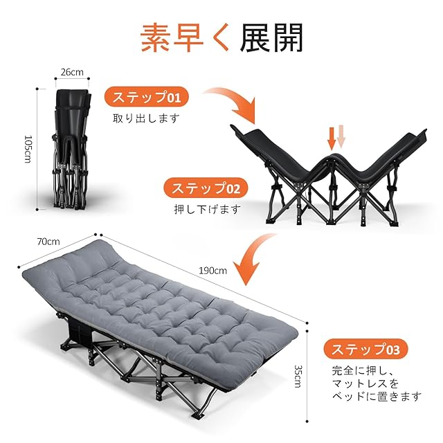 簡単セットアップ&携帯性: 組み立て不要。大人用スリーピングコットは10秒以内に折り畳んで付属の収納袋に入れられ、アウトドア・キャンプ・旅行・車中泊などに最適です。