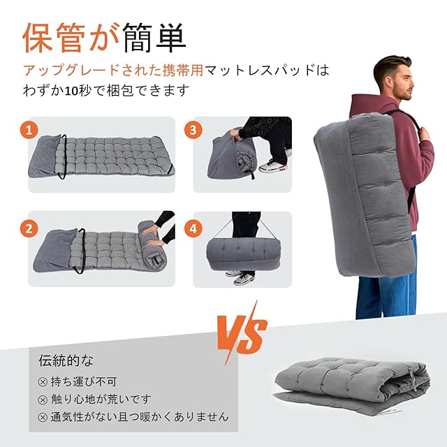 携帯性に優れたクッション: ユニークなデザインにより、追加の収納袋なしでも簡単に持ち運びが可能です。