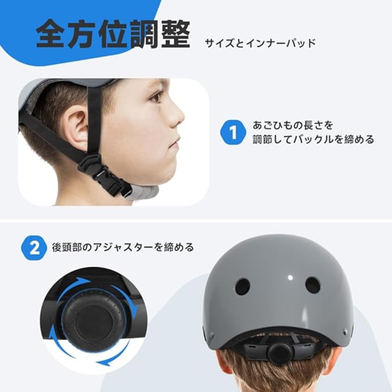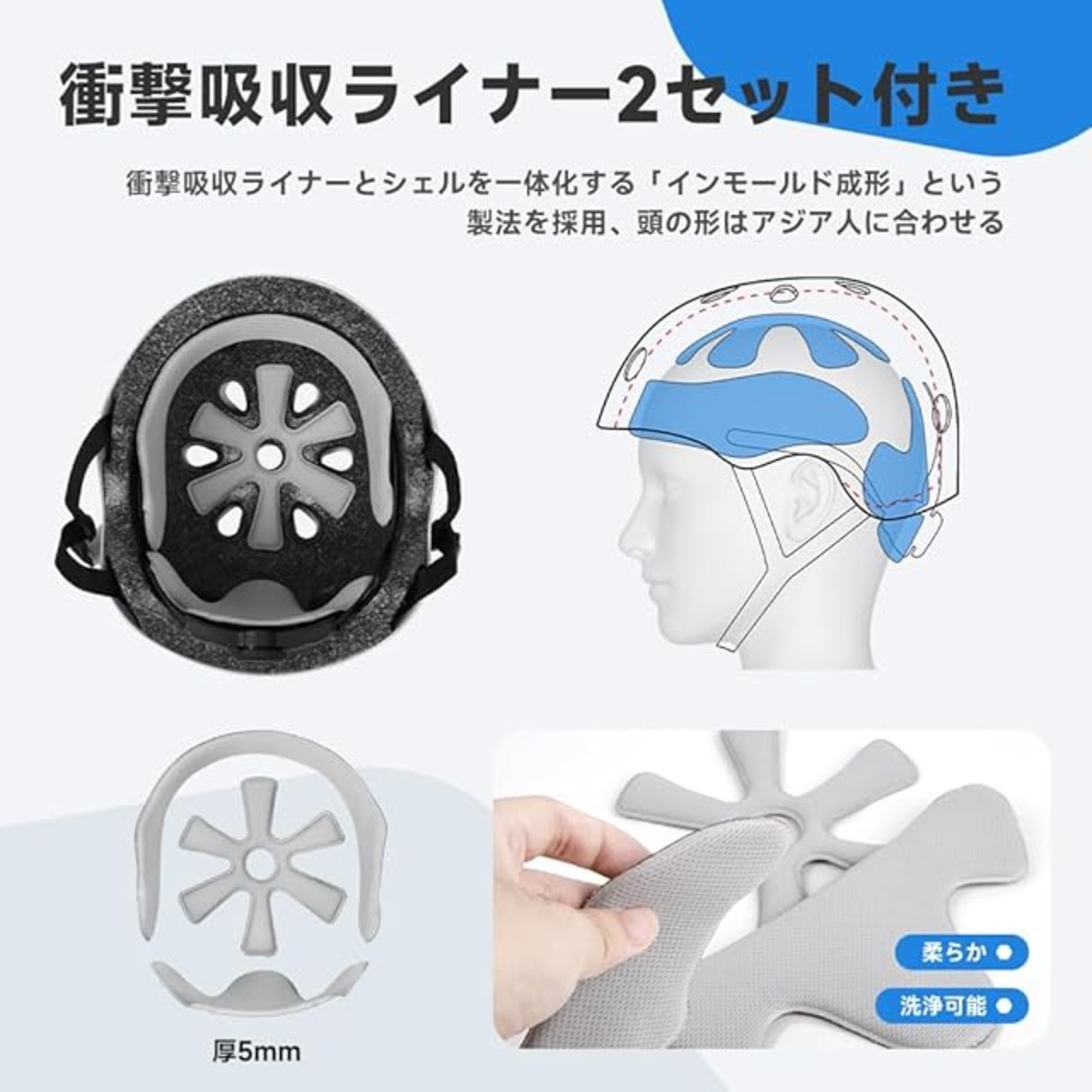 【軽量で通気性も良く】お子様の頭や首への負担が少ないスケートボード用のヘルメットの中がクッション素材の物で出来ているので、シンプルなデザインでとても軽くて嫌がらずに着用もスムーズでムレにくいので、快適に使っています。たくさんの通気口が内側を発散いして夏場は蒸れにくくオールシーズン快適です。子どもの頭にフィットして違和感なく使用出来ます。スタイリッシュで安全性も良く、アウトドアに快適に使用します。