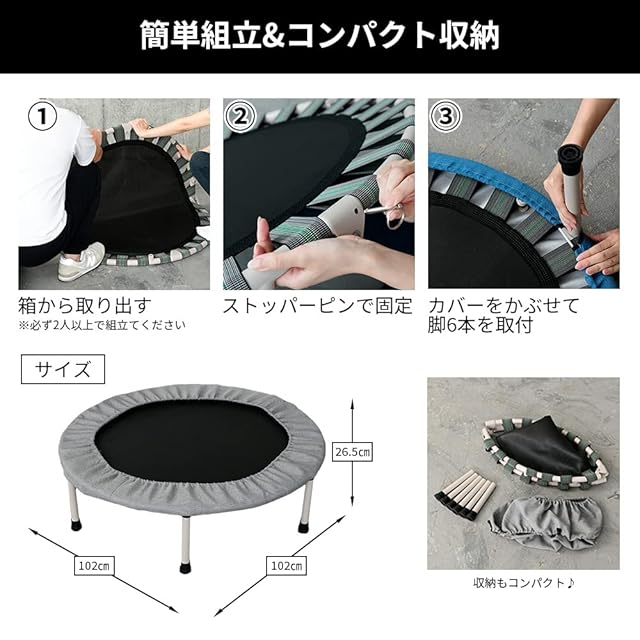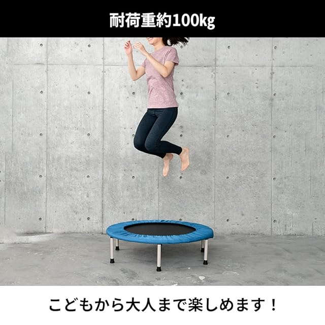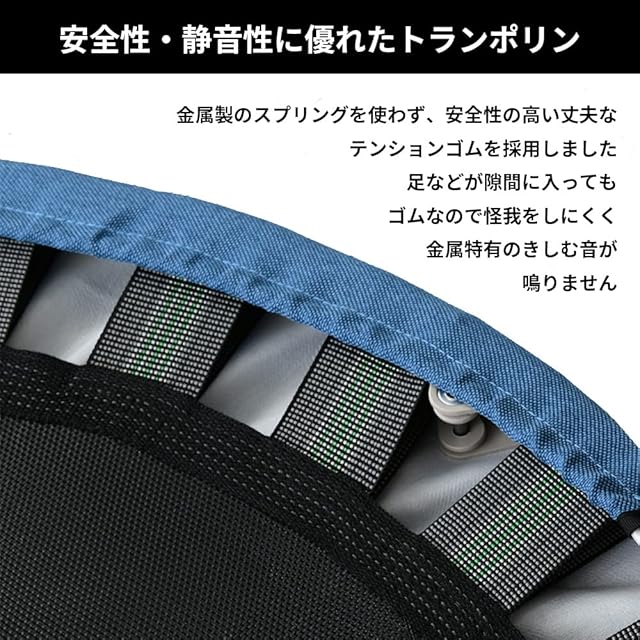 【安全性・静音性に優れたトランポリン】金属製のスプリングを使わず、安全性の高い丈夫なテンションゴムを採用しました。万が一、足などが隙間に入ってしまってもゴムなので怪我をしにくく、金属特有のきしむ音が鳴りません。耐荷重は約100㎏で小さいお子様から大人の方までご使用いただけます。