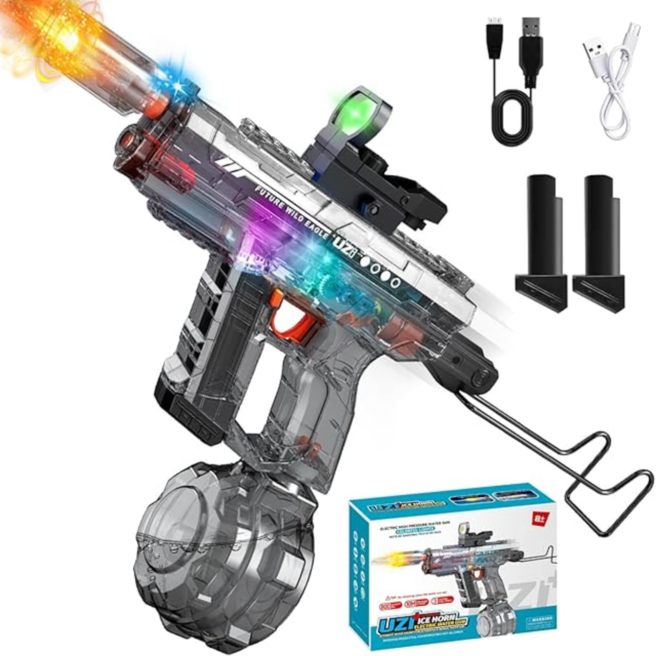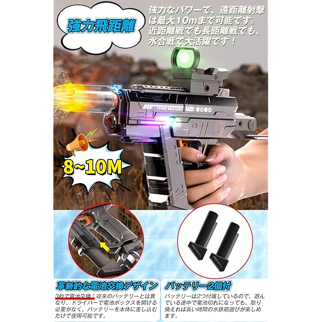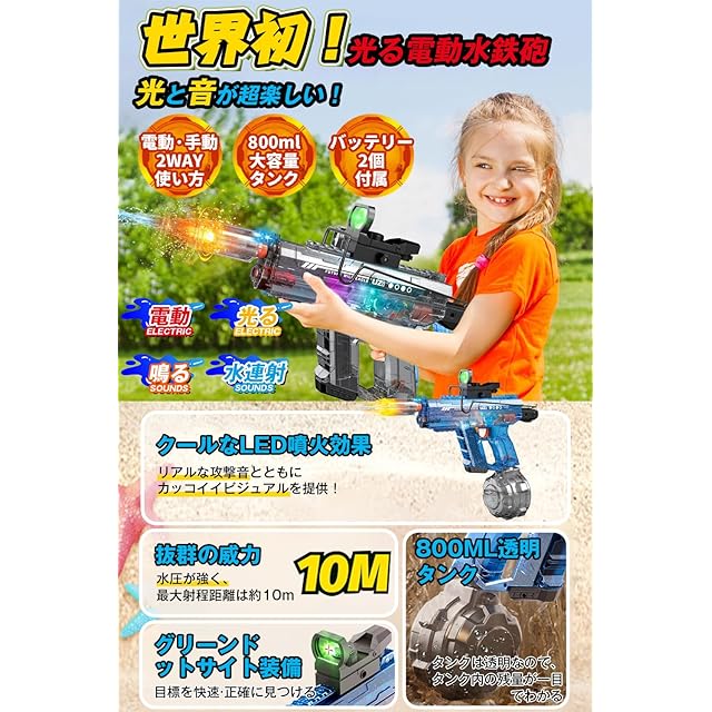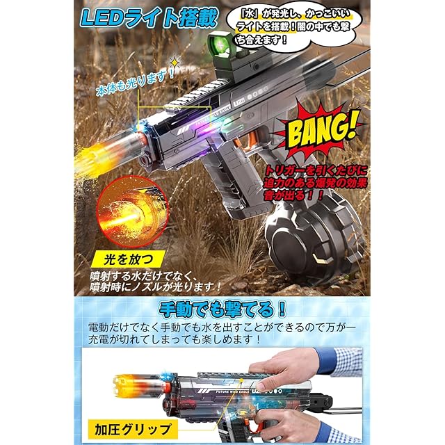 ✪【次世代の電動連射水鉄砲&LED噴火効果&かっこいい射撃音】暑い夏をもっと楽しめるアウトドアアイテム!LEDライト付き水鉄砲が新登場!電動式なので、トリガーを押すだけで超強力な連射が可能!発射口にはフラッシュハットを装備しており、水が流れると本体と発射口がピカピカ光ってリアルな射撃音が鳴ります。昼はもちろんですが夜に遊ぶのがおススメ!夏祭りやキャンプ、花火と一緒に夏遊びに最適です。【ポンプアクションでも撃てる】 電動だけでなく手動でも水を出すことができるので万が一充電が切れてしまっても楽しめます!【グリーンドットサイトスコープ】 水鉄砲バトルで相手を見つけやすくなります。【折りたためるストック】金属製のストックは簡単に折りたたむことができ、収納に便利です。ご注意:噴射口が光るにはフラシュハットの電源をオンにする必要があります。