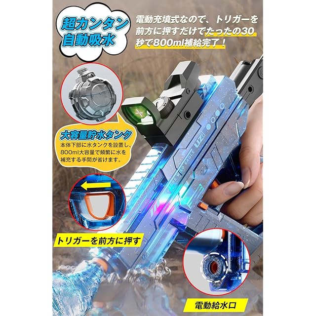 ✪【超カンタン!自動給水&大容量タンク搭載】800MLの大容量のタンクを搭載しており、一度の給水でたっぷり遊べます。面倒な水汲み作業を軽減し、相手を瞬間的に濡らします! 給水は電子制御で、水鉄砲の先端を水につけると、自動的に水をタンクに吸い込みます。トリガーを押してから約20秒で完了するほどのスピード。給水からショットまでをスムーズに楽しめます。水のタンクが透明なので、水がどれだけ残っているのかを確認しやすいです。