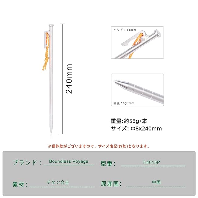 Boundless Voyage チタンペグ ソリッドステーク 強靭 反射ロープ付き ペグ チタン製 高強度 耐食 軽量ペグ 24cm 30cm 35cm 40cm ペグタープ テントペグ 岩場 砂浜 砂利 硬い土 草地 鍛造ペグ 設営用具 アウトドア キャンプ用品(Ti4015P24-6) | つむぎ屋