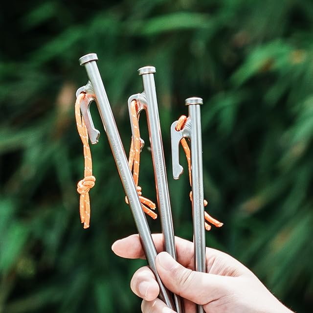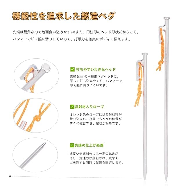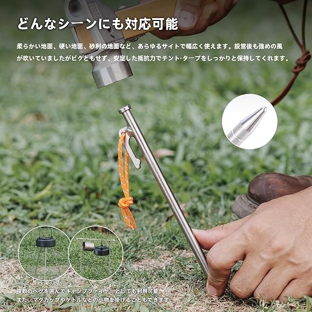 【チタン合金製ペグ】軽量で頑丈なチタン合金で作られ、十分な強度が備え、歪みが少なく、折れることもなく何度も繰り返し使うことができます! 鍛造ペグに負けない強度を持ちながら重さはその半分から3分の1にもなります。