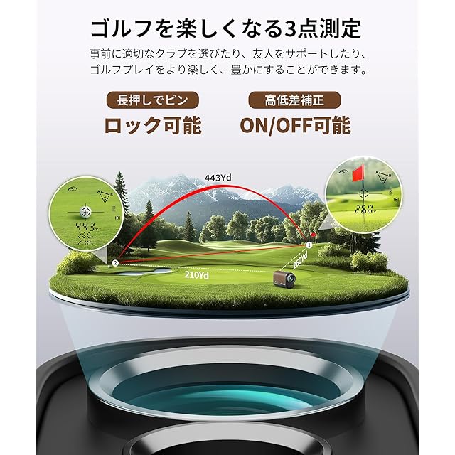 【小柄ながら高性能】前作よりも小型化・軽量化を実現しながらも、ゴルフに必要な機能をしっかり搭載しています。カートから目標物を事前に測定し、最適なクラブを選べる「3点間距離測定モード」に高低差補正のON/OFF切替も可能です。もっと快適なゴルフをサポートします。
